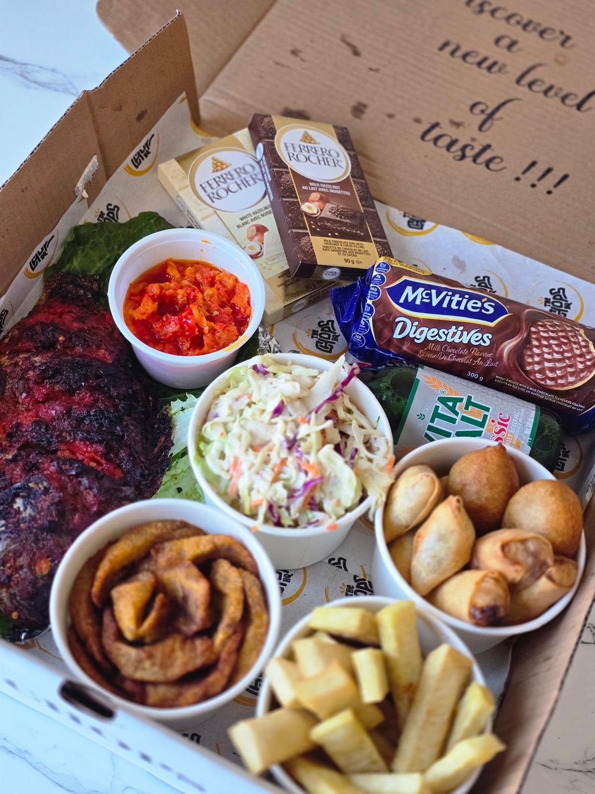 grilled fish, yam fries, plantain, 2 spring roll, 2 prawn roll, 2 samosa, 8 puff puff, pepper sauce