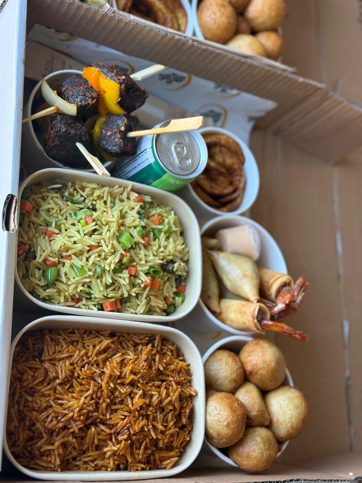 grilled fish, grilled turkey or turkey, jollof rice, yam fries or plantain, 3 beef kebab, 3 prawn roll, 3 samosa, 10 puff puff, pepper sauce
